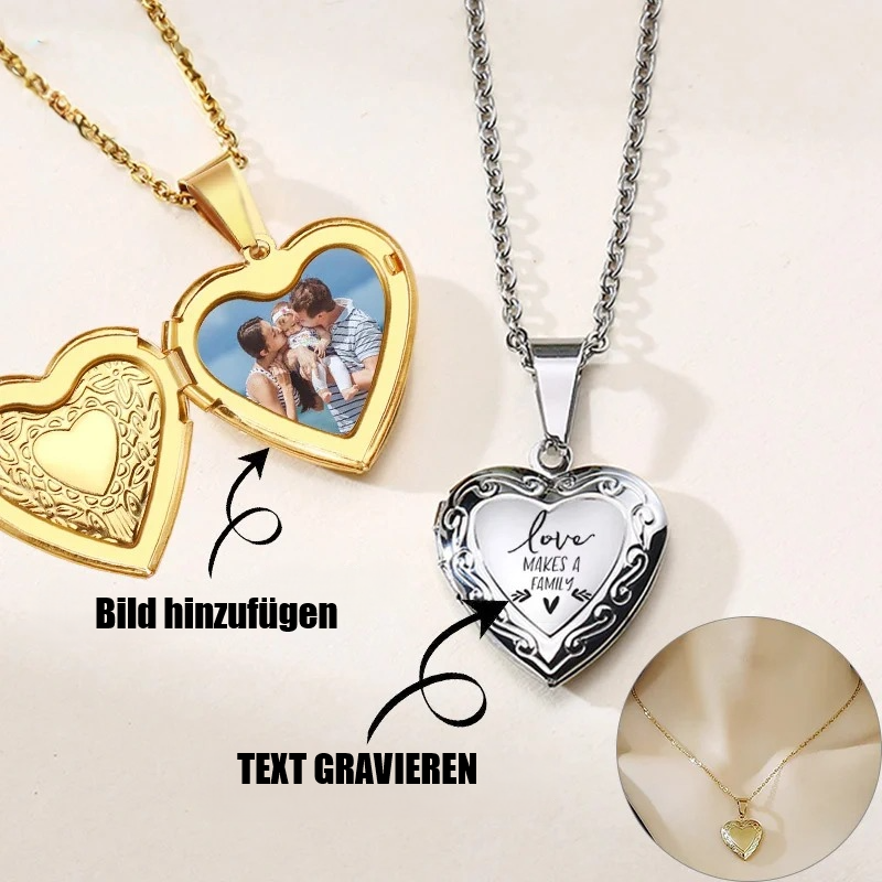 Die Foto Medallion Halskette mit Textgravur ist eine personalisierte Damen Halskette, die mit einem einzigartigen Wunschtext gestaltet werden kann. Der Anhänger in Herzform verfügt über einen ffnenden Foto-Rahmen im Inneren, in den du ein Foto einlegen kannst.