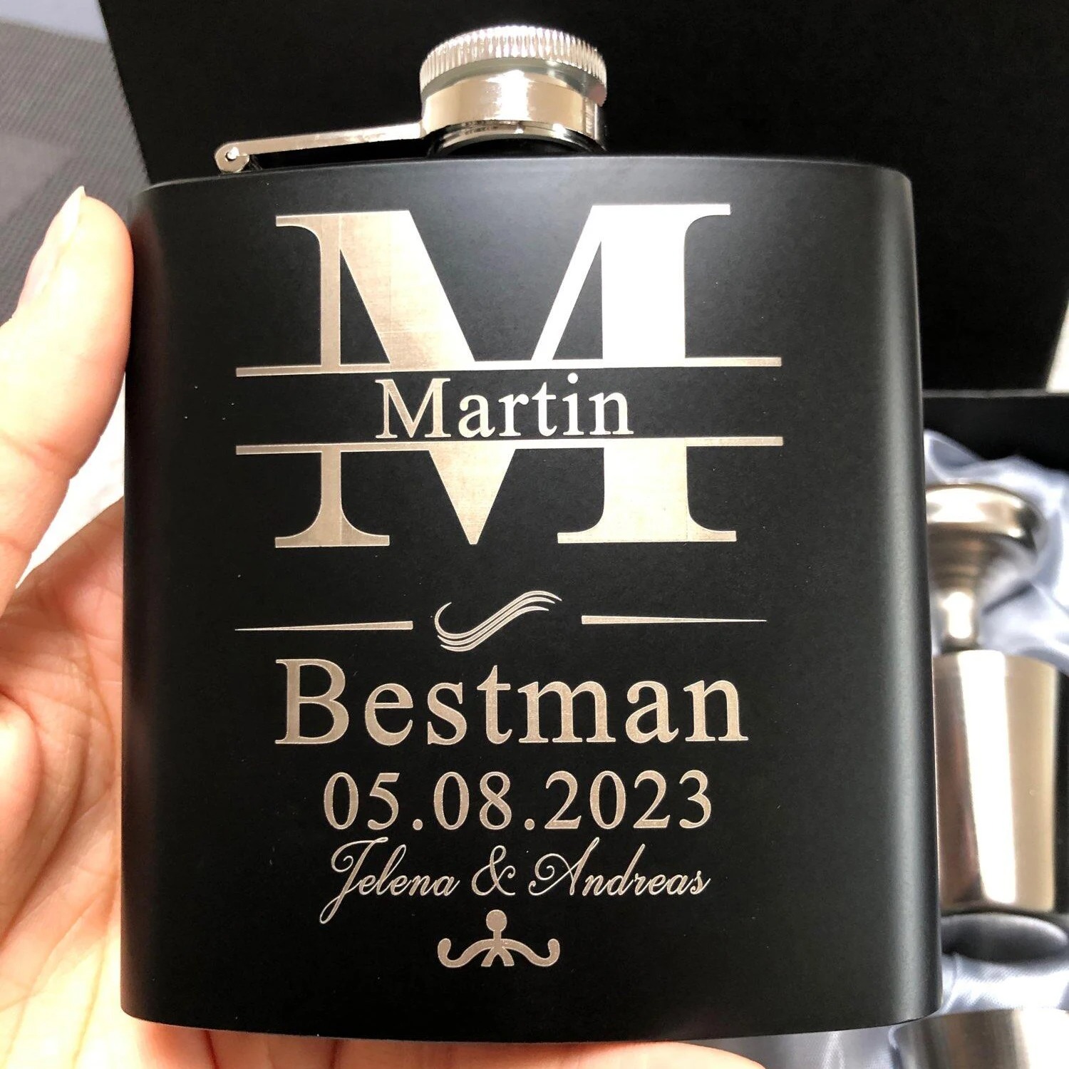 Der personalisierte Flachmann wird hochwertig graviert und kommt als edles Geschenkset – perfekt für besondere Anlässe. Das Set enthält neben dem Flachmann auch eine Geschenkbox, zwei Trinkbecher und einen praktischen Trichter zum einfachen Befüllen. Ein stilvolles und individuelles Präsent für Männer und Frauen, das Eindruck hinterlässt.