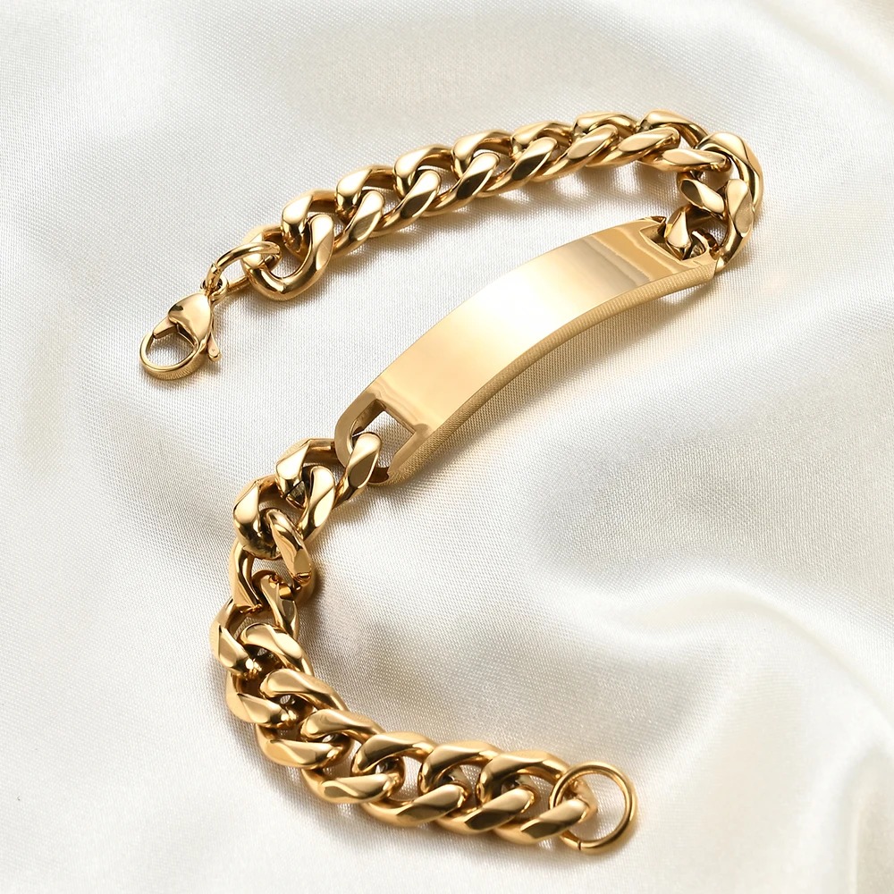Verleihe deinem Look eine markante und persönliche Note mit diesem individuell gravierbaren Cuban Chain Armband. Ob Name, Datum, Initialen oder ein kleines Symbol – gestalte dein Armband ganz nach deinem Geschmack und mache es zu einem charakterstarken Accessoire für jeden Tag.