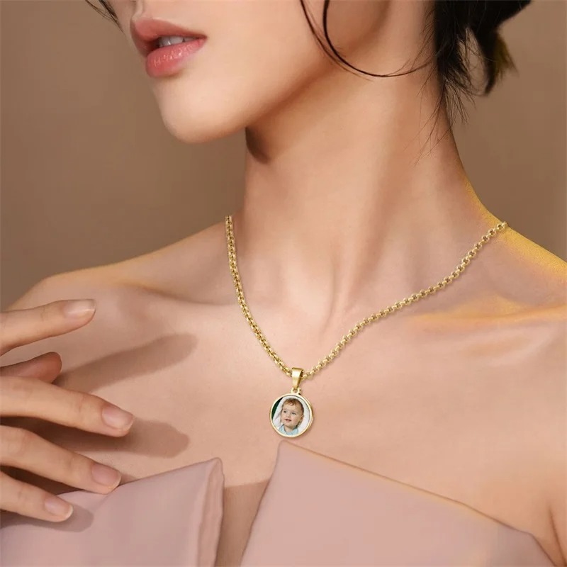 Halskette mit eigenem Foto – personalisierbares Schmuckstück mit Bildmotiv & Wunschtext-Gravur, stilvoll, einzigartig und perfekte Geschenkidee.